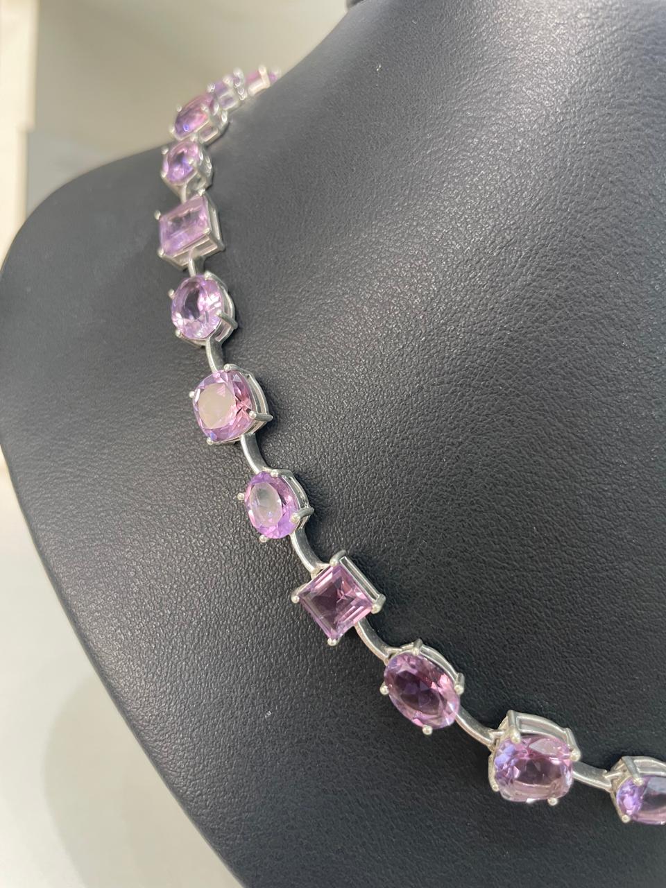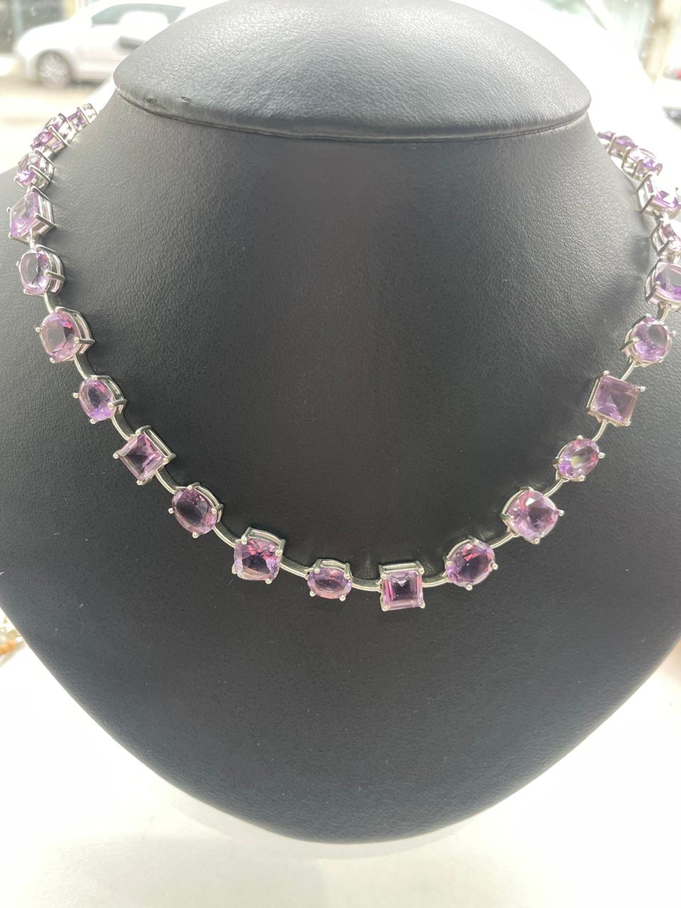 COLAR DE PRATA E AMETISTAS QUADRADAS E OVAIS