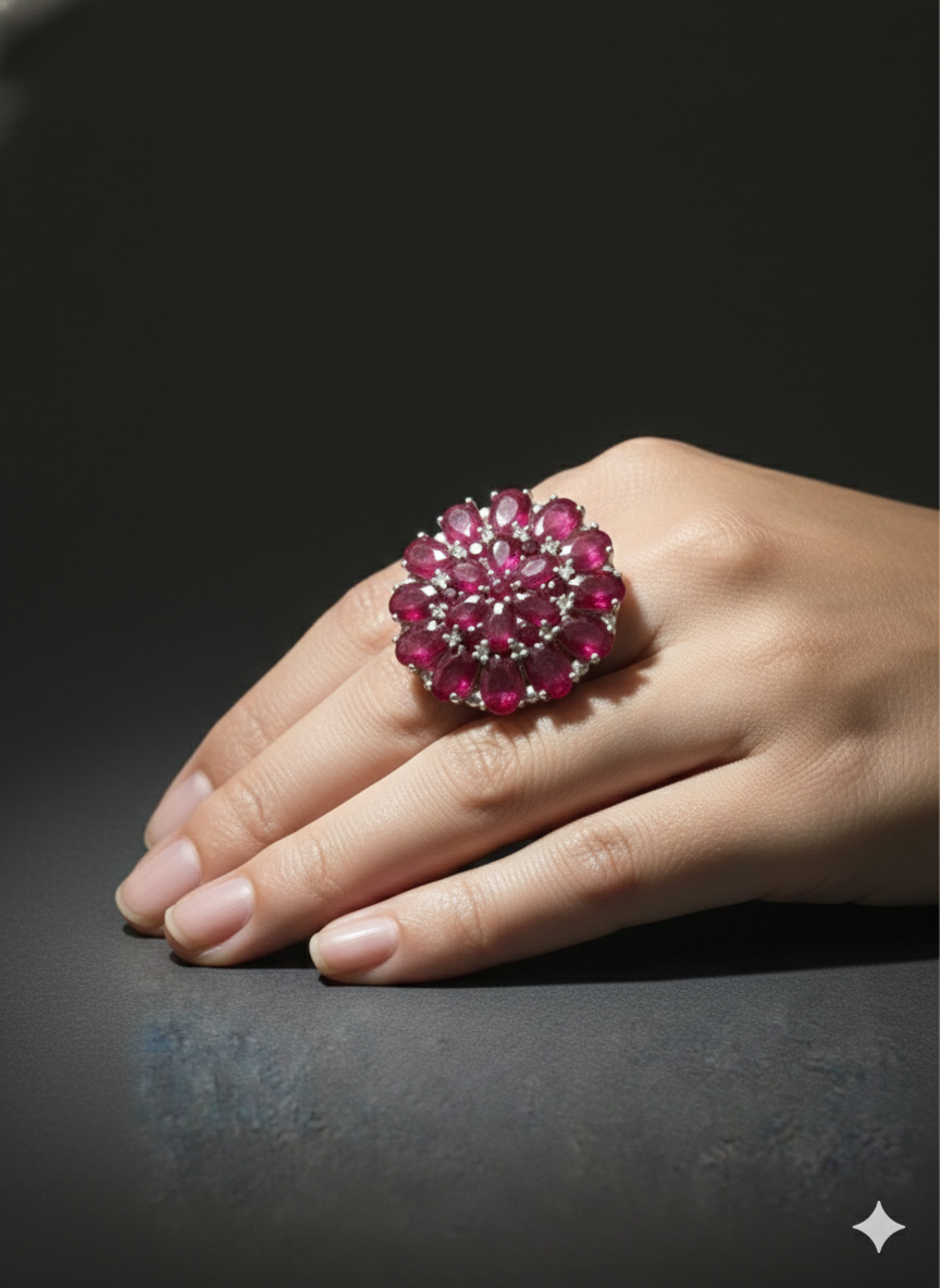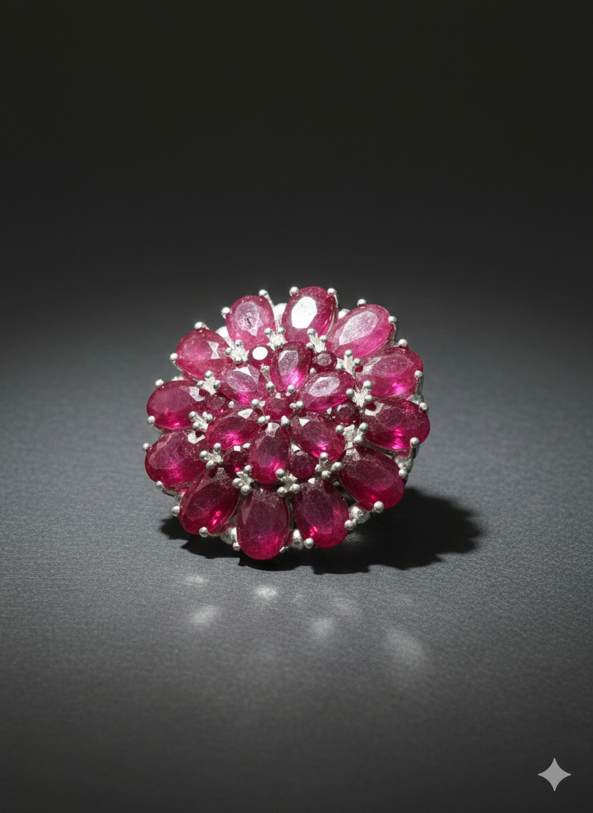 ANEL CONFECCIONADO EM PRATA DE ALTA QUALIDADE 925, COM BANHO DE OURO BRANCO QUE GARANTE BRILHO DURADOURO.AS PEDRAS DE RUBI INDIANO LAPIDADAS ADICIONAM SOFISTICAÇÃO A PEÇA,