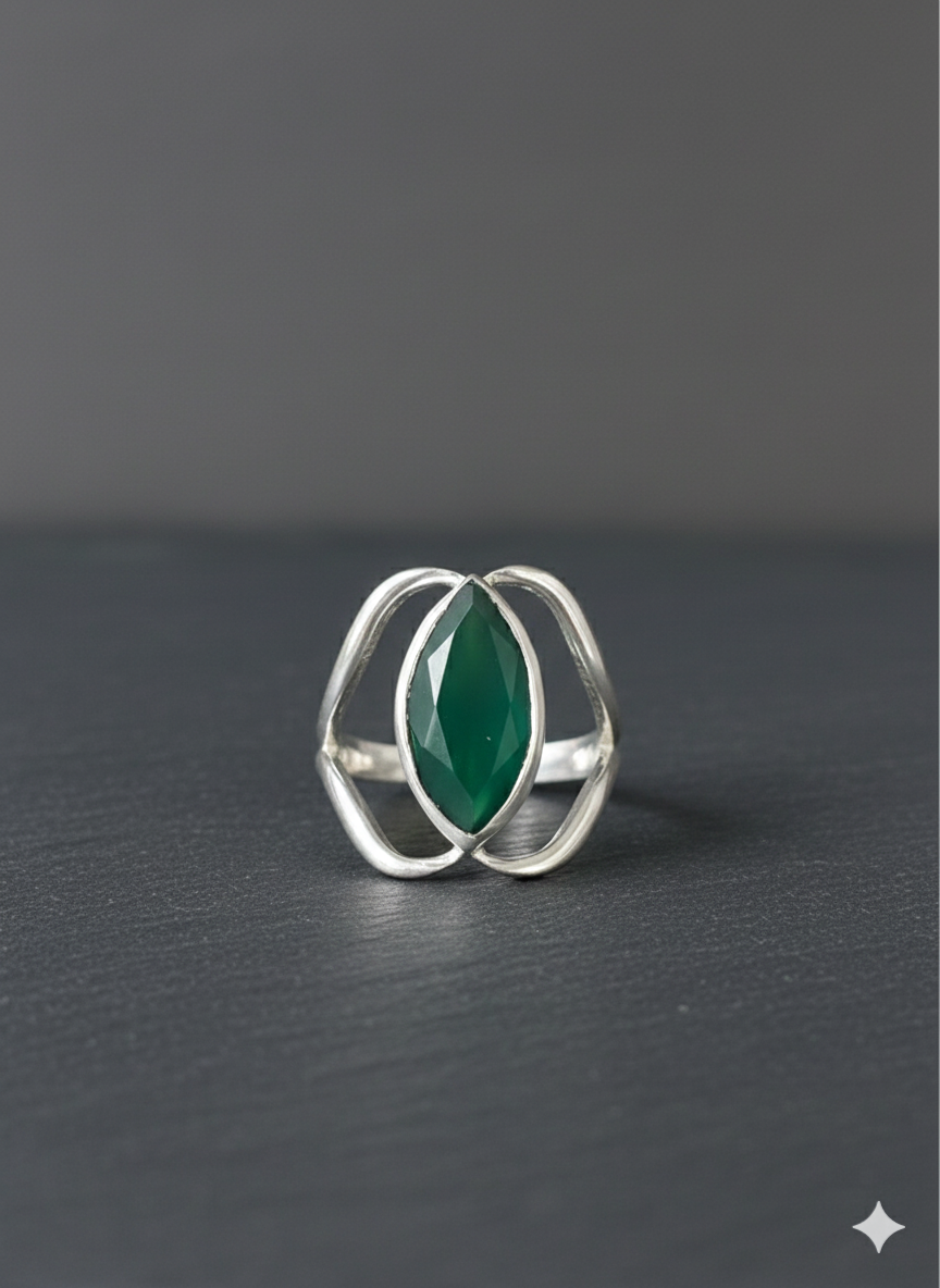 ENCANTE-SE COM NUESTRO LINDO ANEL DE PRATA 925, E PEDRA NATURAL ESMERALDA EM FORMATO NAVETE. UMA PEÇA LINDA,DELICADA E ÚNICA.