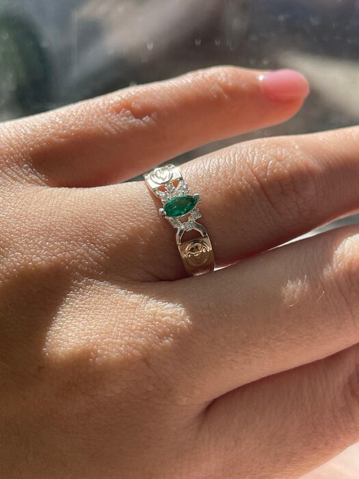 ANEL ELEGANTE DE FORMATURA EM PRATA COM DETALHES EM OURO,APRESENTANDO PEDRA VERDE CENTRAL É SÍMBOLO DA FISIOTERAPIA NAS LATERAIS.
