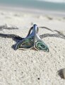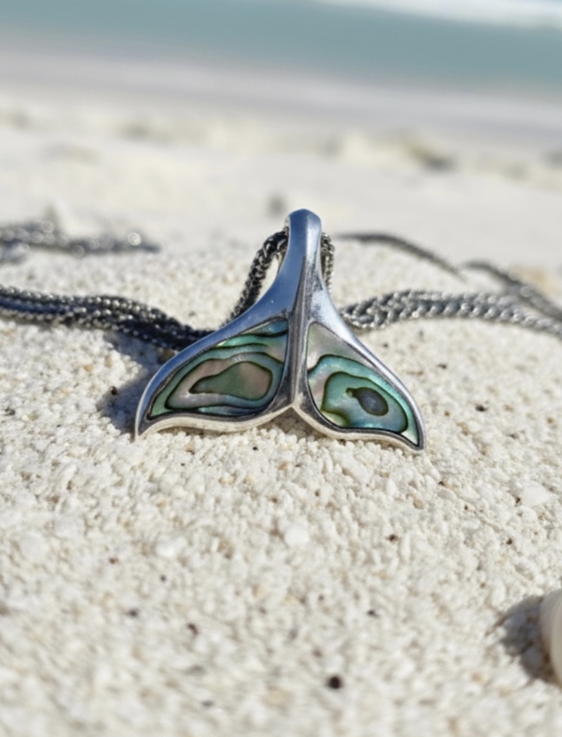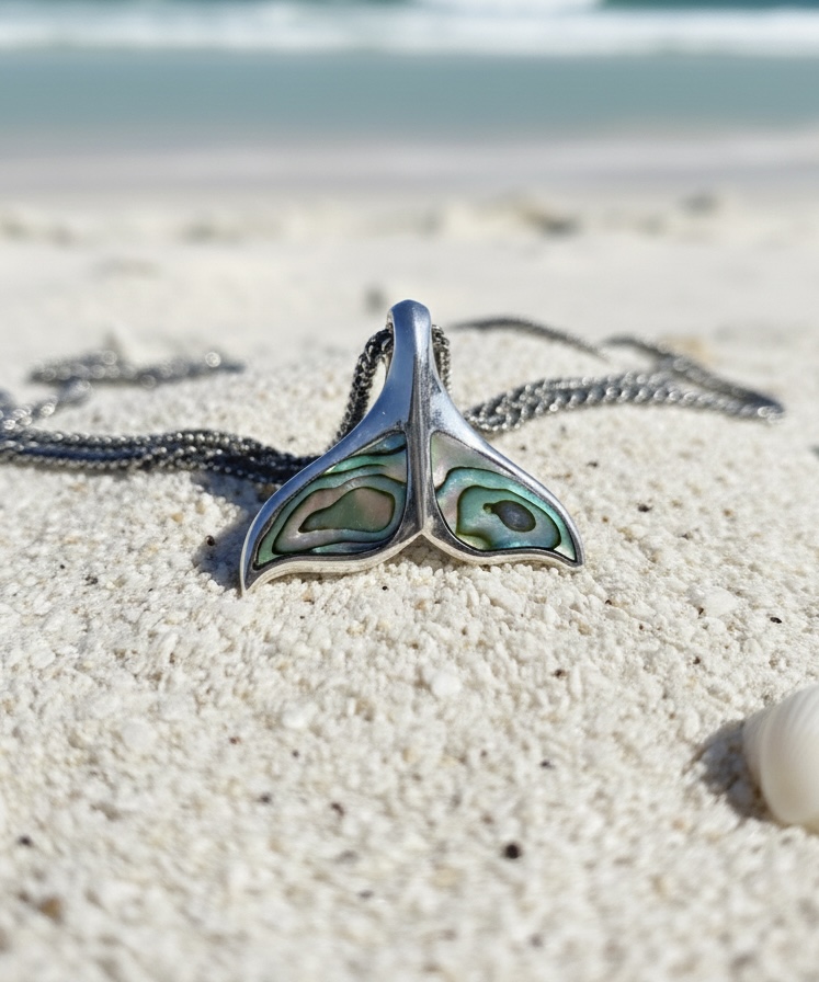 PINGENTE DE PRATA NO FORMATO DE RABO DE BALEIA, COM ABALONE NATURAL QUE REFLETE TONS IRIDESCENTES ÚNICOS.