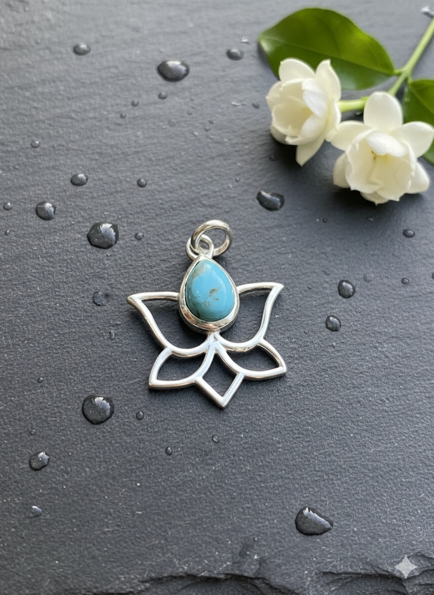 ENCANTE-SE COM NOSSO LINDO PINGENTE DE PRATA 925 EM FORMA DE FLOR DE LOTUS COM PEDRA DE TURQUESA.